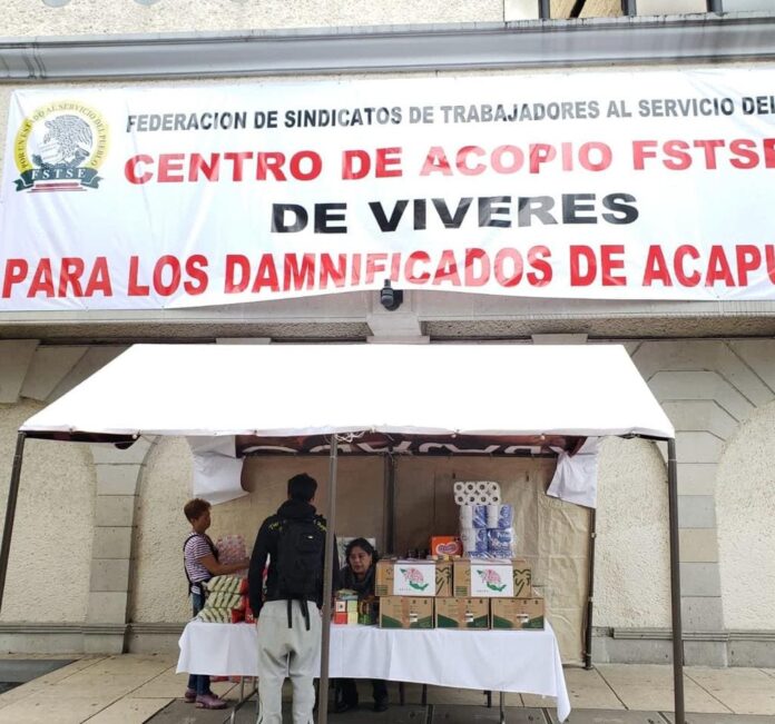 Ciudad de México 27 de octure 2023.- En solidaridad con los habitantes de Acapulco y otros municipios de Guerrero, afectados por el huracán «Otis», la Central FSTSE, instaló un centro de acopio de víveres con el fin de recibirlos y enviarlos a los damnificados por el fenómeno meteorológico.