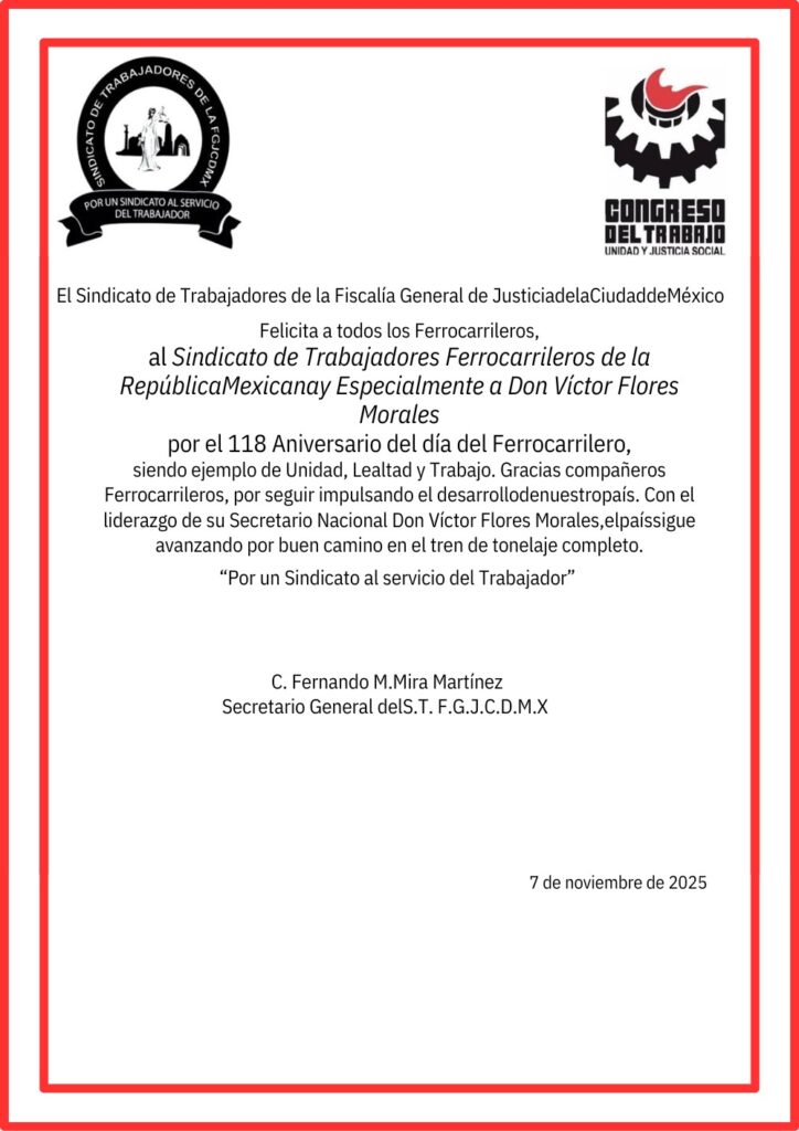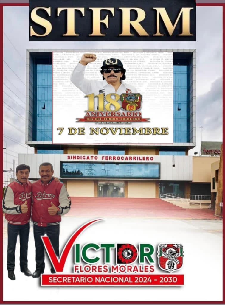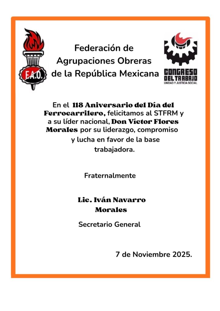 Indicó que este viernes los dirigentes sindicales agrupados en el organismo cúpula del movimiento obrero del país, estaremos presentes en el 118 Aniversarios del Día del Ferrocarrilero, acompañando a su líder Don Víctor Flores Morales y manifestándole nuestro reconocimiento por su visión, audacia y sensibilidad humana.
